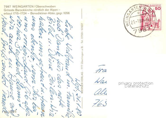 73321285 alte Postkarte Weingarten Wuerttemberg Groesste Barockkirche noerdlich der Alpen Benediktiner Abtei Alpenblick Fliegeraufnahme postalisch gelaufen Erhaltung siehe scans [FriedD77] KatCode: 11110008436082