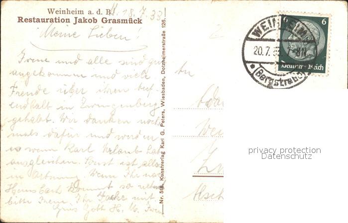 72094212 alte Postkarte Weinheim Bergstrasse postalisch gelaufen Erhaltung siehe scans KatCode: 11110008226096