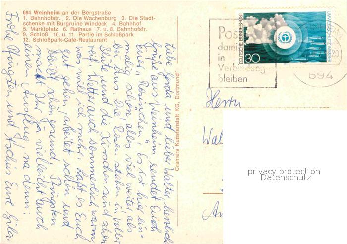72745989 alte Postkarte Weinheim Bergstrasse Bahnhofstrasse Wachenburg Burgruine Windeck Bahnhof Marktplatz Rathaus Schloss Park postalisch gelaufen Erhaltung siehe scans [FriedD77] KatCode: 11110008226096