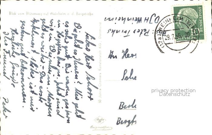 72592292 alte Postkarte Weinheim Bergstrasse Blick vom Bluetenweg postalisch gelaufen Erhaltung siehe scans [AndreD76] KatCode: 11110008226096