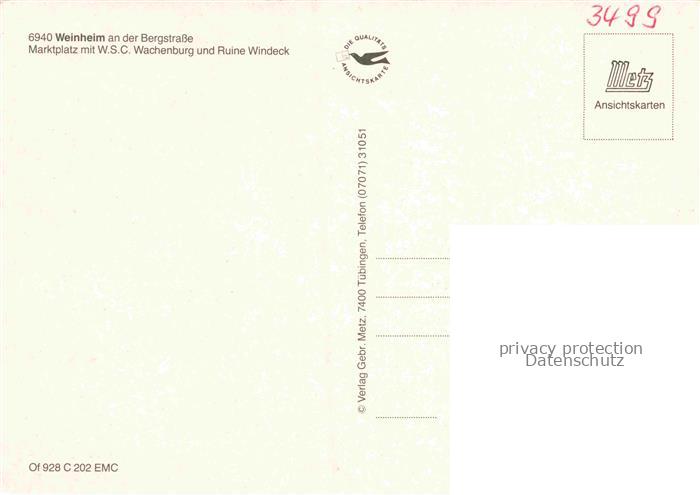 34144816 WEINHEIM Bergstrasse BW Marktplatz mit W.S.C. Wachenburg und Ruine Windeck postalisch nicht gelaufen Erhaltung siehe scans [FriedD77] KatCode: 11110008226096
