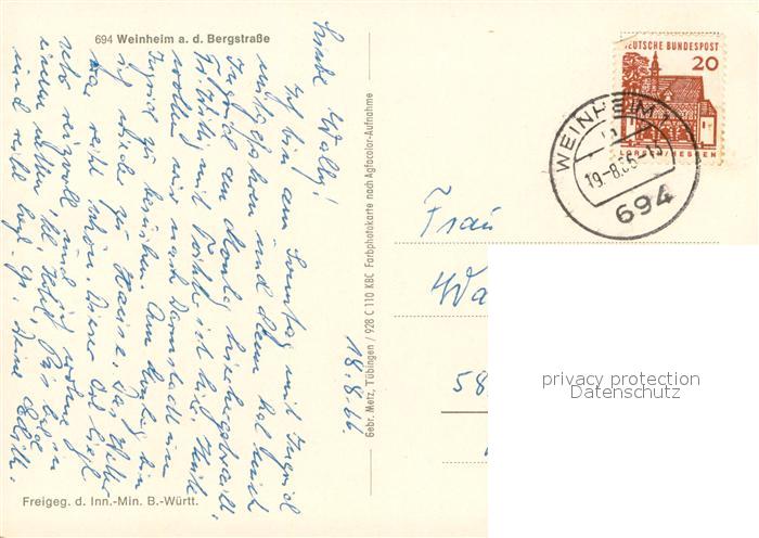 73616738 alte Postkarte Weinheim Bergstrasse Fliegeraufnahme postalisch gelaufen Erhaltung siehe scans [WerneD78] KatCode: 11110008226096