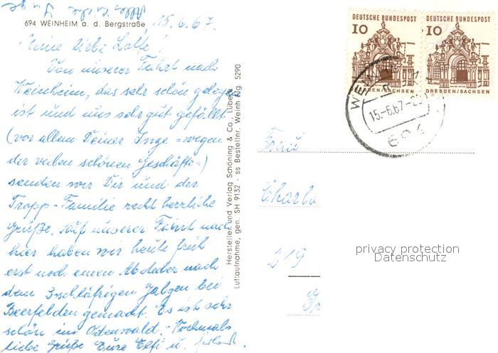 73124479 alte Postkarte Weinheim Bergstrasse Fliegeraufnahme postalisch gelaufen Erhaltung siehe scans [KathaD81] KatCode: 11110008226096
