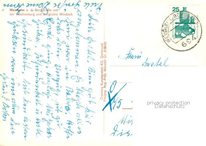 73761110 alte Postkarte Weinheim Bergstrasse Fliegeraufnahme mit der Wachenburg und Burgruine Windeck postalisch gelaufen Erhaltung siehe scans [WerneD78] KatCode: 11110008226096