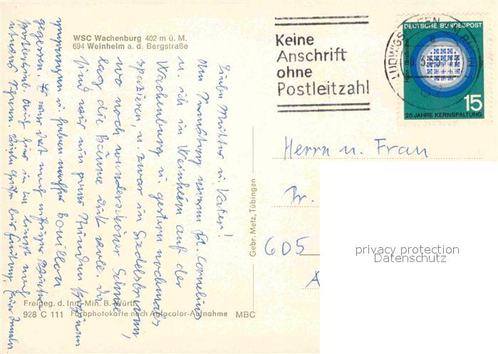 72879506 alte Postkarte Weinheim Bergstrasse Fliegeraufnahme Wachenburg postalisch gelaufen Erhaltung siehe scans [AndreD76] KatCode: 11110008226096