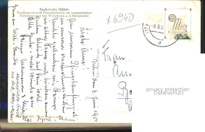 41756873 alte Postkarte Weinheim Bergstrasse Fuchs sche Muehle Ausflugsort Fremdenheim Birkenauertal postalisch gelaufen Erhaltung siehe scans KatCode: 11110008226096