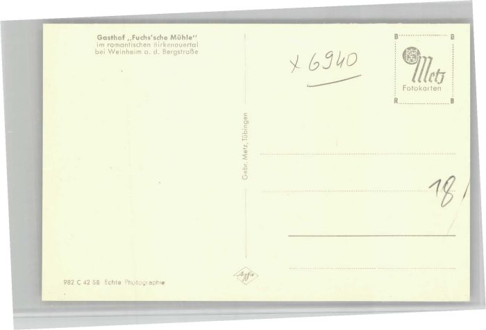 40706840 Weinheim Bergstrasse Gasthof Fuchs´sche Mühle Birkenauertal * KatCode 11110008226096