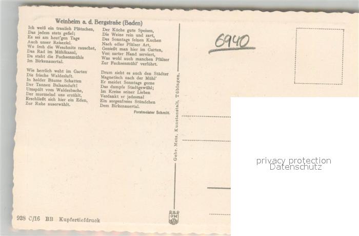 42931597 Weinheim Bergstrasse Gasthof Pension Fuchsche Muehle postalisch nicht gelaufen Erhaltung siehe scans [AndreD76] KatCode: 11110008226096