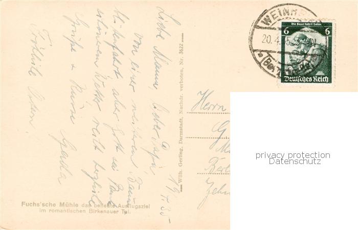 73792439 alte Postkarte Weinheim Bergstrasse Gasthof-Pension Fuchssche Muehle Aussenansicht postalisch gelaufen Erhaltung siehe scans [LiesaD40] KatCode: 11110008226096