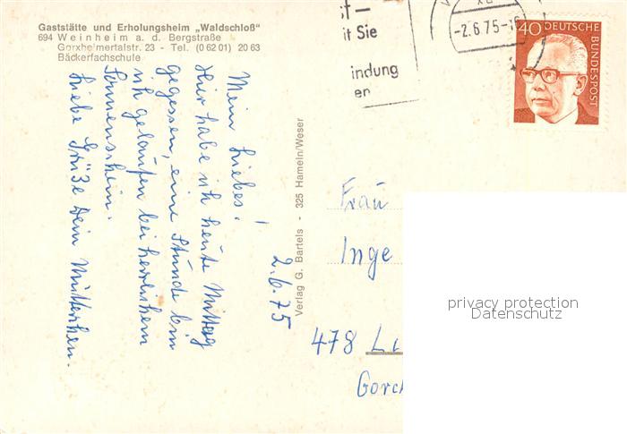 73543008 alte Postkarte Weinheim Bergstrasse Gaststaette Erholungsheim Waldschloss postalisch gelaufen Erhaltung siehe scans [FriedD77] KatCode: 11110008226096