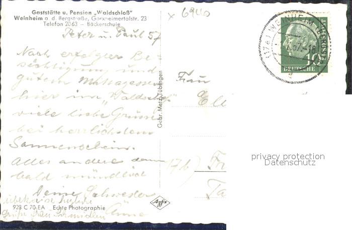 41756875 alte Postkarte Weinheim Bergstrasse Gaststaette Pension Waldschloss postalisch gelaufen Erhaltung siehe scans KatCode: 11110008226096