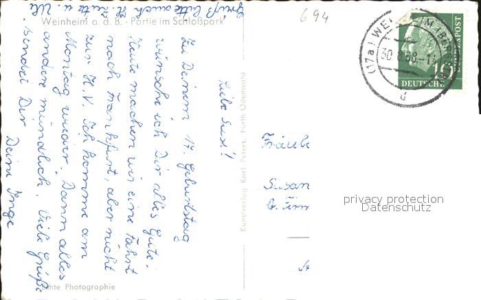 72602760 alte Postkarte Weinheim Bergstrasse Partie im Schlosspark Turm Burgruine postalisch gelaufen Erhaltung siehe scans [FriedD77] KatCode: 11110008226096