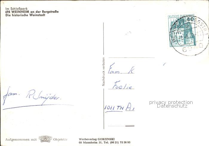 72246251 alte Postkarte Weinheim Bergstrasse Schlosspark postalisch gelaufen Erhaltung siehe scans KatCode: 11110008226096