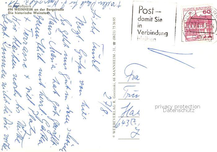 73040768 alte Postkarte Weinheim Bergstrasse Schlosspark postalisch gelaufen Erhaltung siehe scans [NatalD47] KatCode: 11110008226096