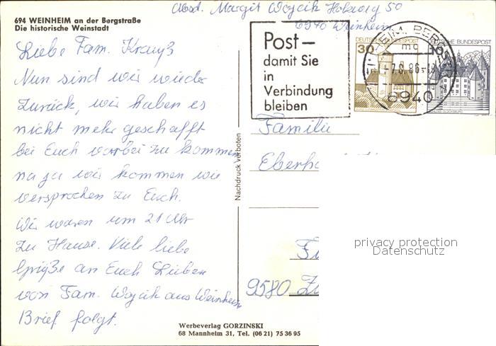 72522404 alte Postkarte Weinheim Bergstrasse Schlosspark postalisch gelaufen Erhaltung siehe scans KatCode: 11110008226096
