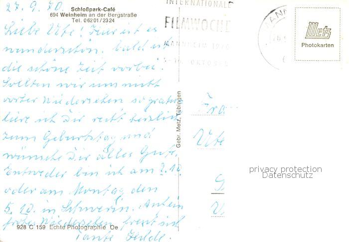 73829509 alte Postkarte Weinheim Bergstrasse Schlosspark Cafe postalisch gelaufen Erhaltung siehe scans [WerneD78] KatCode: 11110008226096