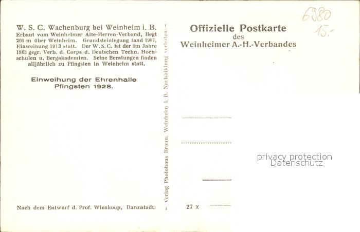72096272 Weinheim Bergstrasse W. S. C. Wachenburg postalisch nicht gelaufen Erhaltung siehe scans KatCode: 11110008226096