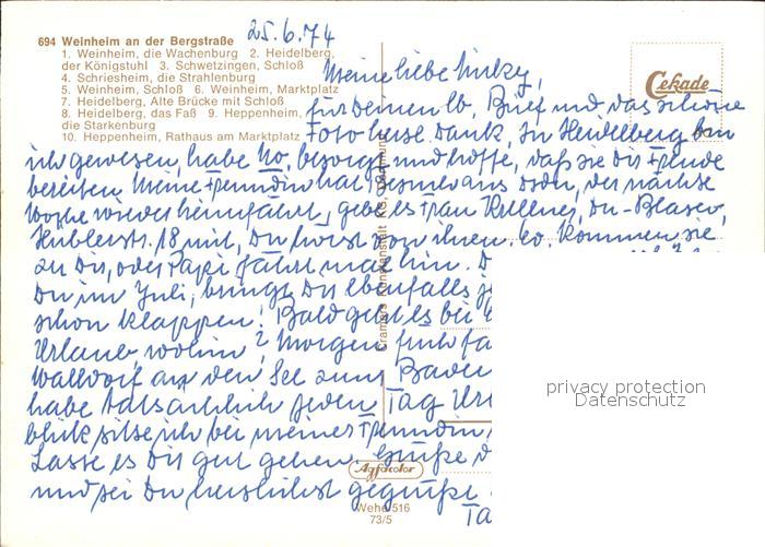 72450632 alte Postkarte Weinheim Bergstrasse Wachenburg Koenigstuhl Heidelberg Marktplatz Heppenheim postalisch gelaufen Erhaltung siehe scans KatCode: 11110008226096