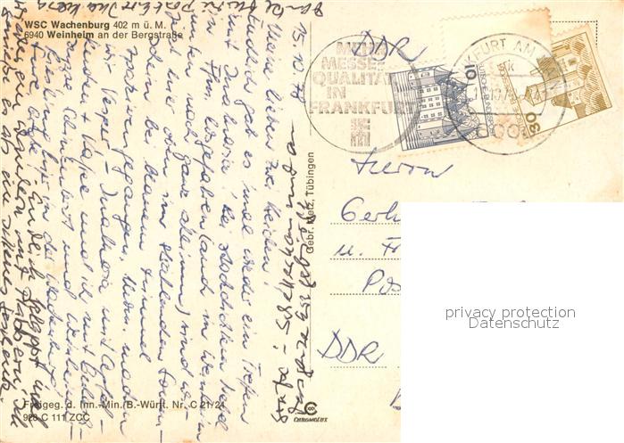 73701617 alte Postkarte Weinheim Bergstrasse WSC Wachenburg Fliegeraufnahme postalisch gelaufen Erhaltung siehe scans [WerneD78] KatCode: 11110008226096