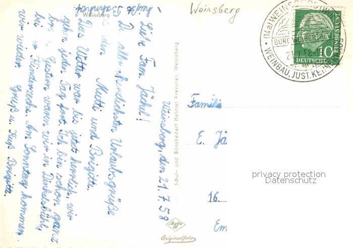 32731833 alte Postkarte Weinsberg Fliegeraufnahme postalisch gelaufen Erhaltung siehe scans [WerneD78] KatCode: 11110008125102