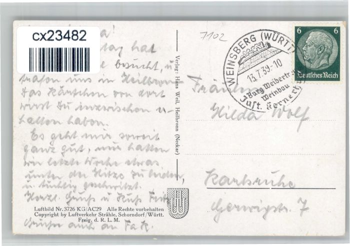 30752214 alte Postkarte Weinsberg Fliegeraufnahme postalisch gelaufen KatCode: 11110008125102