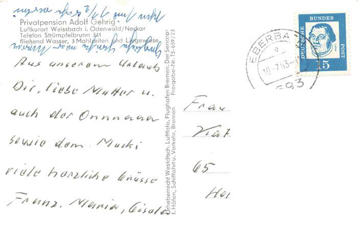 73972737 alte Postkarte Weisbach Waldbrunn Odenwald Privatpension A. Gehring postalisch gelaufen Fliegeraufnahme Erhaltung siehe scans [FriedD77] KatCode: 11110008225118