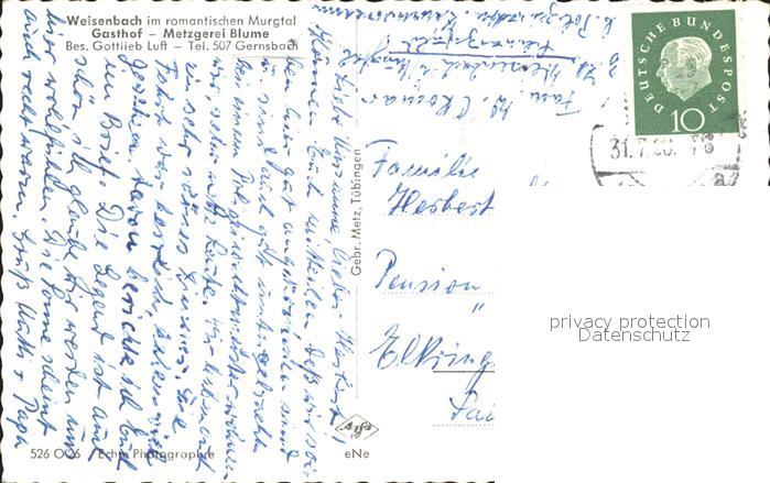 72202515 alte Postkarte Weisenbach Murgtal Fliegeraufnahme Gasthof Metzgerei Blume postalisch gelaufen Erhaltung siehe scans KatCode: 11110008216059