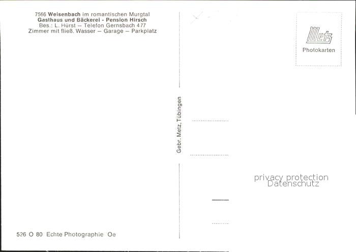 41768035 Weisenbach Murgtal Gasthaus Baeckerei Hirsch postalisch nicht gelaufen Erhaltung siehe scans KatCode: 11110008216059