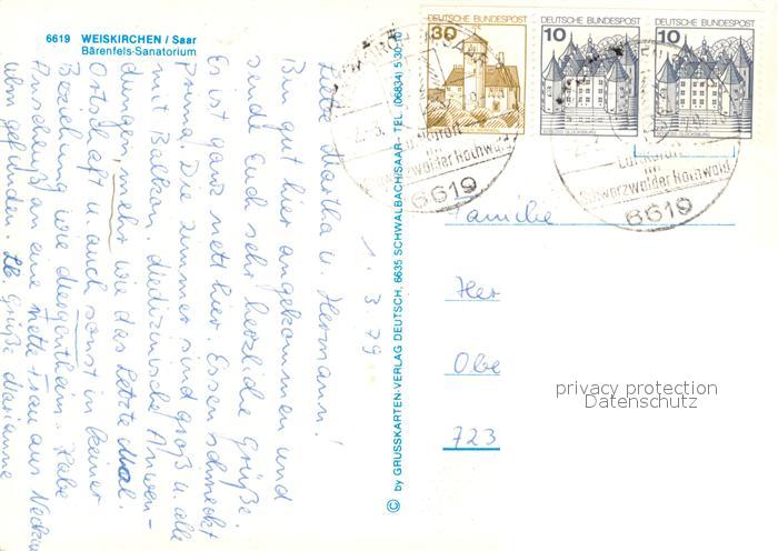 73687354 alte Postkarte Weiskirchen Saar Baerenfels Sanatorium Empfang Restaurant Kegelbahnen Hallenbad postalisch gelaufen Erhaltung siehe scans [FriedD77] KatCode: 11110010042117
