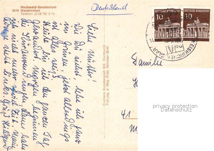 72951740 alte Postkarte Weiskirchen Saar Fliegeraufnahme Hochwald-Sanatorium postalisch gelaufen Erhaltung siehe scans [NatalD47] KatCode: 11110010042117
