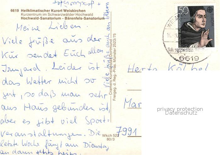 73128535 alte Postkarte Weiskirchen Saar Fliegeraufnahme Kurzentrum Schwarzwaelder Hochwald postalisch gelaufen Erhaltung siehe scans [NatalD47] KatCode: 11110010042117