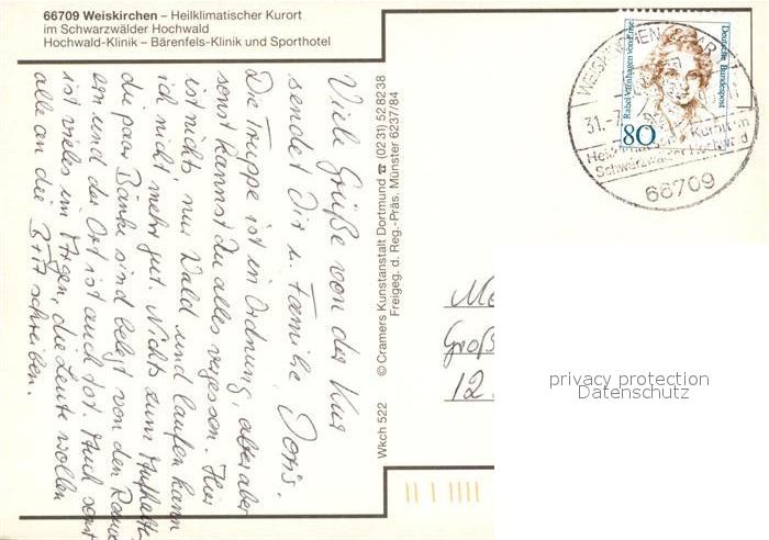 73110310 alte Postkarte Weiskirchen Saar Fliegeraufnahme Kurzentrum Weiskirchen postalisch gelaufen Erhaltung siehe scans [NatalD47] KatCode: 11110010042117