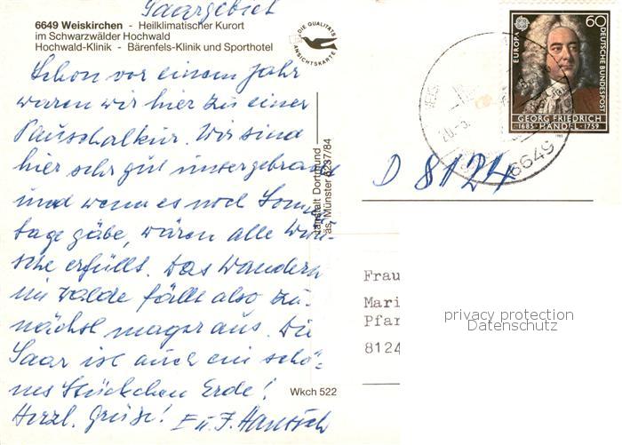 73804349 alte Postkarte Weiskirchen Saar Hochwald Klinik Baerenfels Klinik und Sporthotel Fliegeraufnahme postalisch gelaufen Erhaltung siehe scans [WerneD78] KatCode: 11110010042117