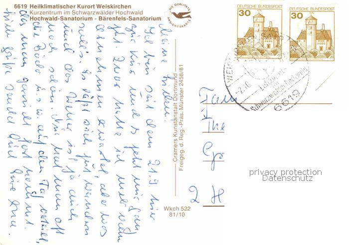 72833569 alte Postkarte Weiskirchen Saar Hochwald Sanatorium Baerenfels Sanatorium Schwarzwaelder Hochwald Fliegeraufnahme postalisch gelaufen Erhaltung siehe scans [FriedD77] KatCode: 11110010042117