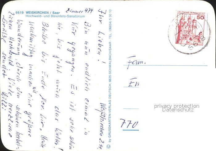 72329476 alte Postkarte Weiskirchen Saar Hochwald und Baerenfels Sanatorium postalisch gelaufen Erhaltung siehe scans KatCode: 11110010042117