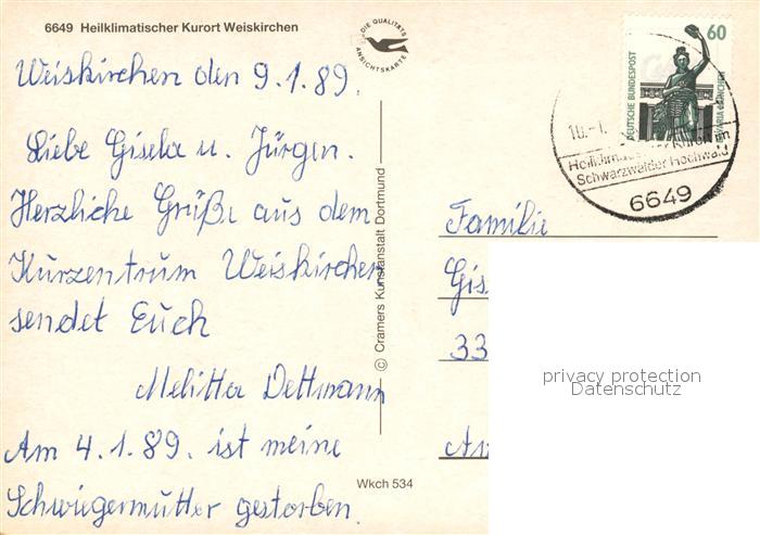 73081991 alte Postkarte Weiskirchen Saar Kurparksee Holzbachtal Kurzentrum Sporthotel Fliegeraufnahme Schwarzwaelder Hochwald postalisch gelaufen Erhaltung siehe scans [FriedD77] KatCode: 11110010042117