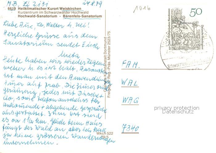 73635874 alte Postkarte Weiskirchen Saar Kurzentrum im Schwarzwaelder Hochwald Sanatorium Baerenfels Fliegeraufnahme postalisch gelaufen Erhaltung siehe scans [FriedD77] KatCode: 11110010042117
