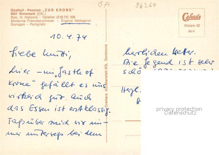 73648673 Weismain Gasthof Pension Zur Krone Gastraum postalisch nicht gelaufen Erhaltung siehe scans [FriedD77] KatCode: 11110009478176
