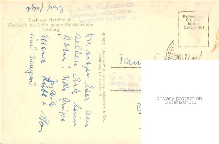 73677620 alte Postkarte Weissbach Lofer Gasthaus Hirschbuehel postalisch gelaufen Erhaltung siehe scans [LiesaD40] KatCode: 11390322050627