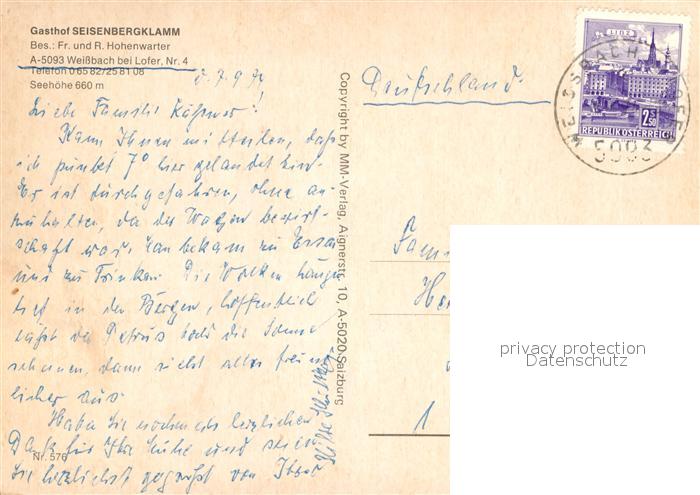 13009041 alte Postkarte Weissbach Lofer Gasthof Seisenbergklamm postalisch gelaufen Erhaltung siehe scans [NatalD47] KatCode: 11390322050627