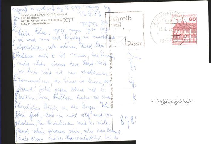 72240260 alte Postkarte Weissbach Pfronten Parkhotel Flora Cafe Restaurant Wintersportplatz Alpenpanorama postalisch gelaufen Erhaltung siehe scans KatCode: 11110009777159