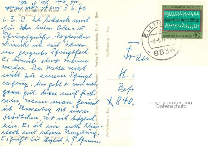 73745626 alte Postkarte Weissenburg Bayern Schweppermann Brunnen Wuelzburg Eingang Panorama postalisch gelaufen Erhaltung siehe scans [WerneD78] KatCode: 11110009577177