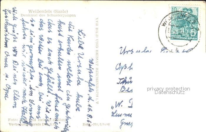 72297204 alte Postkarte Weissenfels Saale Denkmal des Schusterjungen postalisch gelaufen Erhaltung siehe scans KatCode: 11110015084550