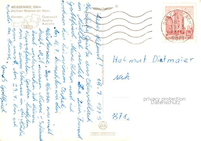 73856058 alte Postkarte Weissensee Kaernten AT Hoechster Badesee der Alpen postalisch gelaufen Fliegeraufnahme Erhaltung siehe scans [FriedD77] KatCode: 11390212020639