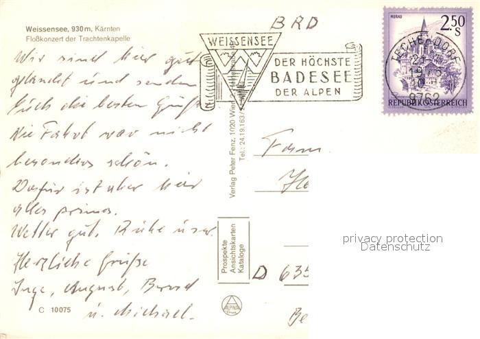 73146730 alte Postkarte Weissensee Kaernten Flosskonzert der Trachtenkapelle postalisch gelaufen Erhaltung siehe scans [FriedD77] KatCode: 11390212020639