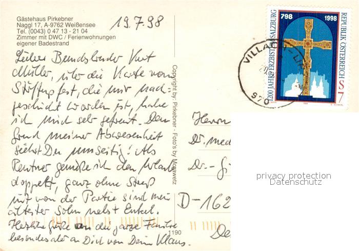 73643904 alte Postkarte Weissensee Kaernten Gaestehaus Pension Pirkebner Badestrand Landschaftspanorama Alpen postalisch gelaufen Erhaltung siehe scans [FriedD77] KatCode: 11390212020639