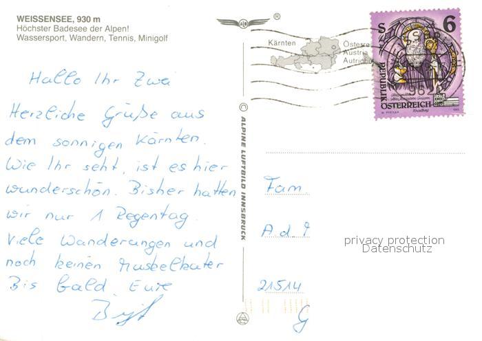 73360428 alte Postkarte Weissensee Kaernten Hoechster Badesee der Alpen Fliegeraufnahme postalisch gelaufen Erhaltung siehe scans [FriedD77] KatCode: 11390212020639