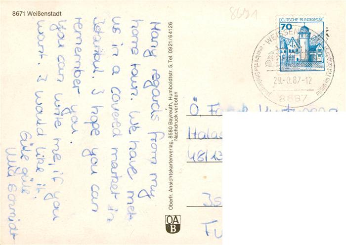 73941297 alte Postkarte Weissenstadt Bayern Panorama Kirche Brunnen postalisch gelaufen Erhaltung siehe scans [FriedD77] KatCode: 11110009479166