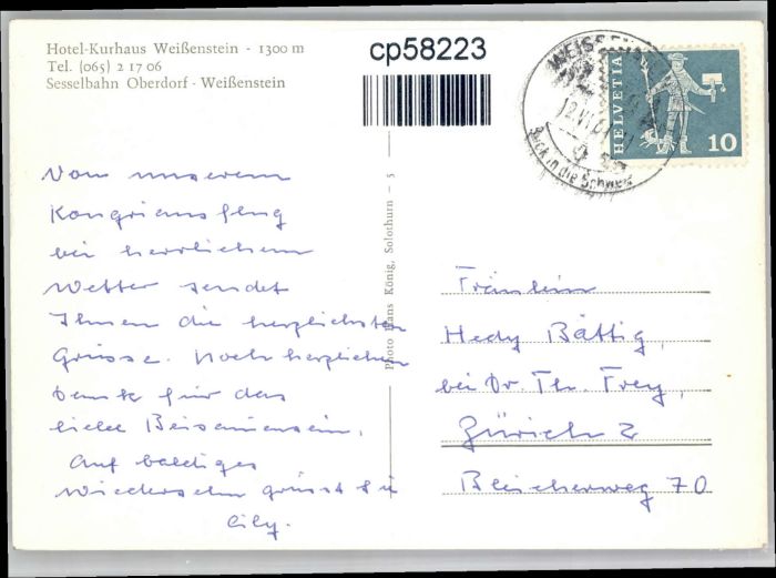 70722588 alte Postkarte Weissenstein SO Weissenstein Hotel Kurhaus postalisch gelaufen KatCode: 11470180525420