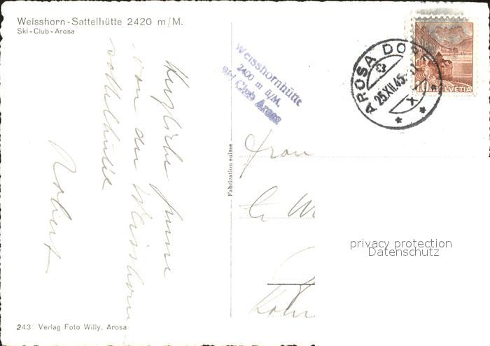 11837348 alte Postkarte Weisshorn Arosa Sattelhuette Ski-Club Skifahren postalisch gelaufen Erhaltung siehe scans KatCode: 11470360545260